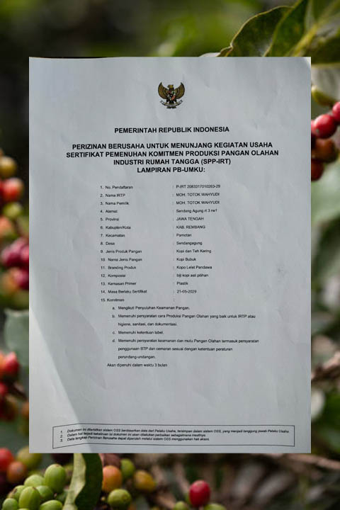 Selain memproduksi kopi dengan bahan-bahan pilihan, tim produksi kami sudah mengikuti Penyuluhah Keamanan Pangan (PKP). Kami juga sudah memiliki Ijin usaha. Produk sudah memperoleh Ijin dari Dinas Kesehatan, dan juga telah disertifikasi Halal oleh MUI.